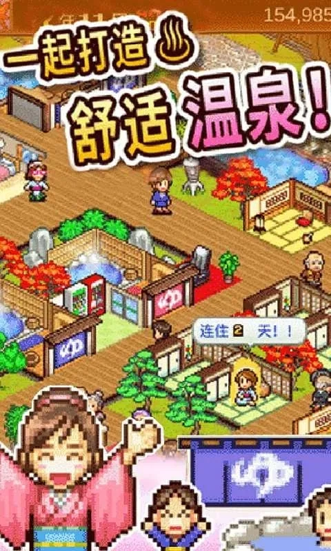 3、**别具一格的游戏感受**:像素风格画面经典,人物卡通呆萌,场景精美细腻。还有超有趣的投票评比、与众不同的建筑契合度、50种客户花式入住、温泉疗效探索等独特玩法,带来别样体验。