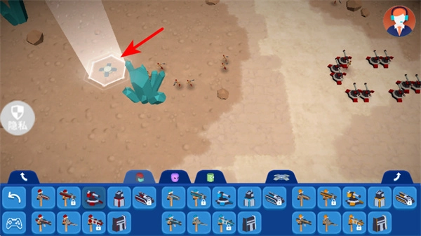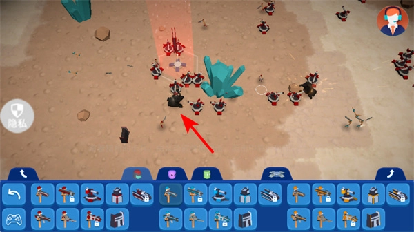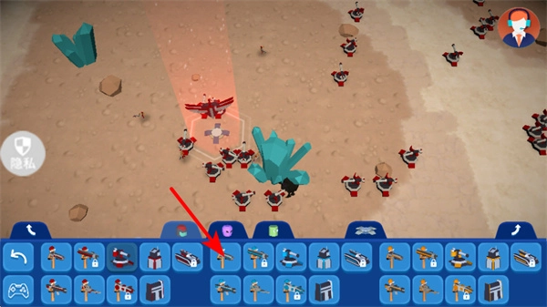 3、根据战场局势,再次点击底部栏的其他单位图标如红色箭头指向的武器,选择作战单位,补充战力应对敌方攻势。