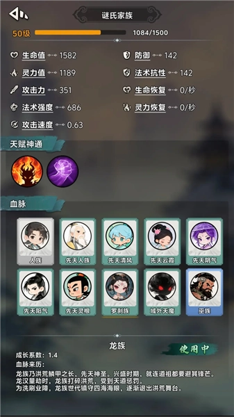 2.在角色界面,可查看生命值、灵力值等属性,选择不同血脉(如龙族),不同血脉有不同成长系数和背景故事。