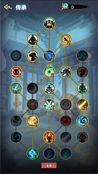 3.在传承界面,通过消耗资源升级各类技能,提升角色能力,可根据需求重置技能点。
