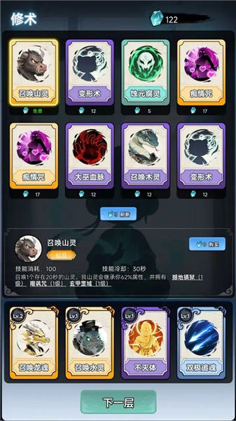 7.在修术界面,选择并购买技能卡牌,如召唤山灵、变形术等,丰富战斗手段,之后可进入下一层继续冒险。