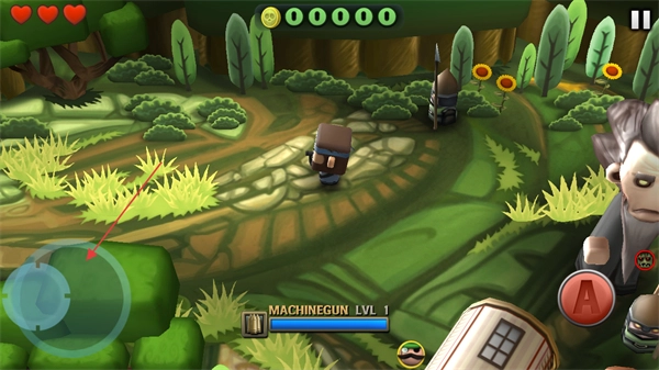 2、通过使用左下角的移动轮盘控制角色躲避冒出的僵尸,并且寻找击杀僵尸的时机。