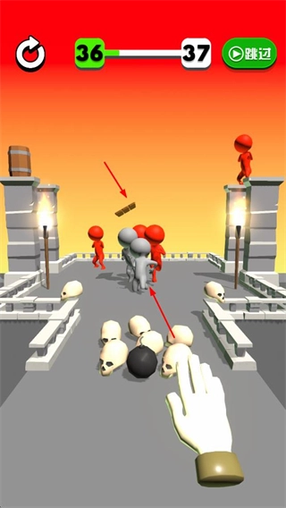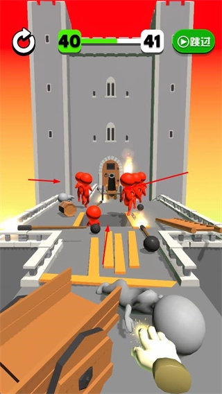 2、在城堡类场景中,瞄准红色敌人释放攻击,借助炸弹等道具击败目标,提升关卡进度。