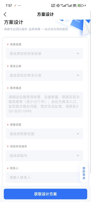 5、最后填写安装场景、需求分类等信息,点击获取设计方案
