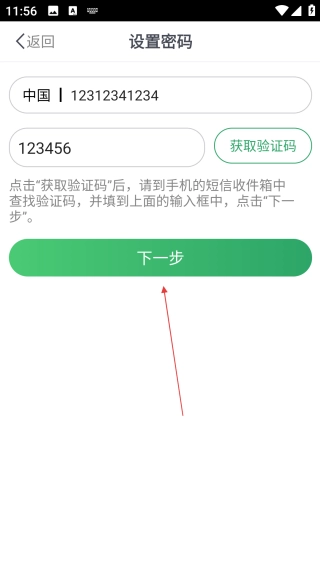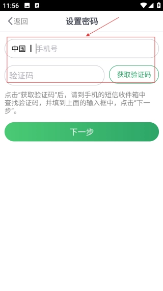 3、在设置密码页,填写【手机号】后点击【获取验证码填写】,完成信息填写。