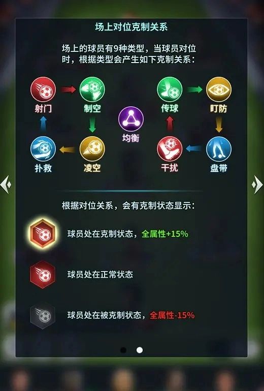 球员总分为9个类型:射门型、凌空型、盘带型、传球型、盯防型、干扰型、扑救型、制空型、均衡型。