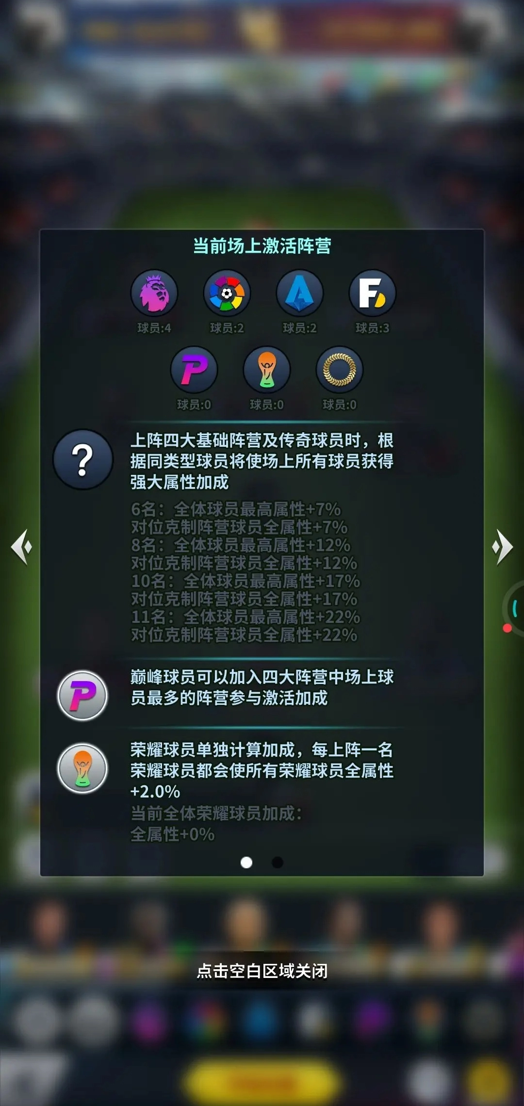 凑阵营加成是目前游戏前期也是最核心的玩法,因此凑满同阵营的球员越多,加成也就越大!