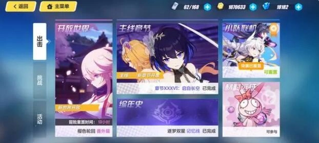 4、开放世界,目前有四个,推荐萌新先打樱色轮回和天命总部,等熟悉了再打后崩坏书的两个。开放世界每周可以接三次委托,分别在周一周四周六刷新,每次有五个委托,里面有初始A角色碎片材料运气好还可以获得水晶。每个委托都需要消耗体力,推荐每周也打完。开放世界除了委托还有一些其他任务,前期能打就打,打不了就先放着。