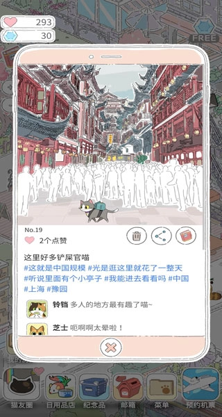 送猫咪出门旅游需要消耗点赞数来购买机票,猫咪在旅行过程中会拍摄照片并分享到猫友圈,以此吸引更多点赞。