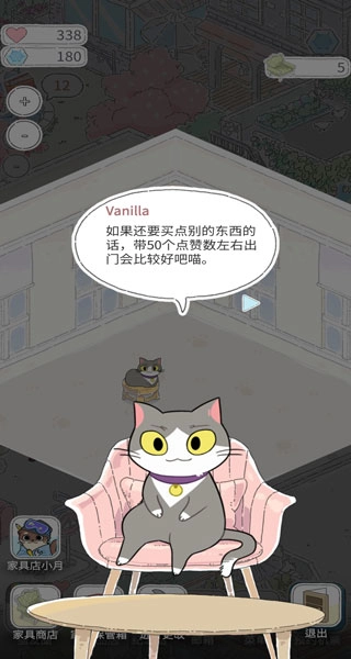 家具店材料由小月送,猫猫旅游送以及钻石兑换获得,摆放家具可以提高舒适度以减少旅行时间