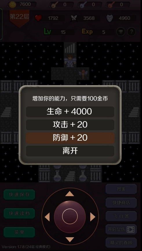 3、第七层的十字架一直到最后再吃,即不把十字架交给仙子就不能打魔王的时候再吃,因为它是按比例加攻防数值;同理14层左右有一个大圣杯,让体力值翻倍,也最后吃(其实不吃也不耽误通关)。或者你操作失误,卡关了,这个时候吃十字架或者圣杯也行。