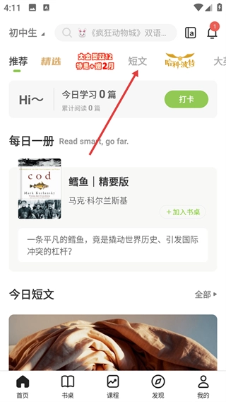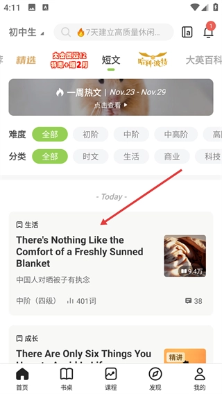 1、在主界面点击顶部的【短文】标签,即可进入短文阅读专区,在这里可以筛选不同难度与分类的英文文章。