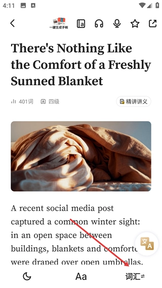 3、在文章阅读页面点击底部【词汇】选项,进入词汇级别设置界面,可自定义标注的词汇大纲。
