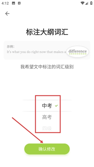 4、在词汇设置界面选择目标级别(如【中考】),点击【确认修改】,即可按该级别标注文中词汇辅助学习。