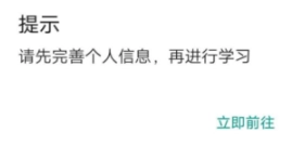 在学习时点击课程,提示“请先完善个人信息,再进行学习”的时候,可以联系培训学校或者单位的管理员,询问证书需要展现的个人信息有哪些,再通过个人信息处上传相应信息即可看课。