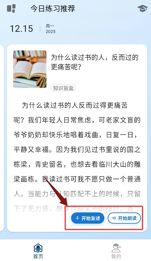 2、首页可选择“开始复述”或“开始朗读”功能进入练习模式。