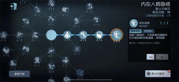 2)辅助位/修机位/补救位(什么叫辅助位,开局就苟,有人被追就开始修机,注意信号准备补救人位的遗产机,救人位救下人之后捂着屁股跑过来找你治疗蹭蹭的):三医者点满,回光返照点上,酌情选择双弹或者搏命(开局比较苟,点自愈和搏命修完机准备二救或者三救,开局容易招鬼就点双弹)。