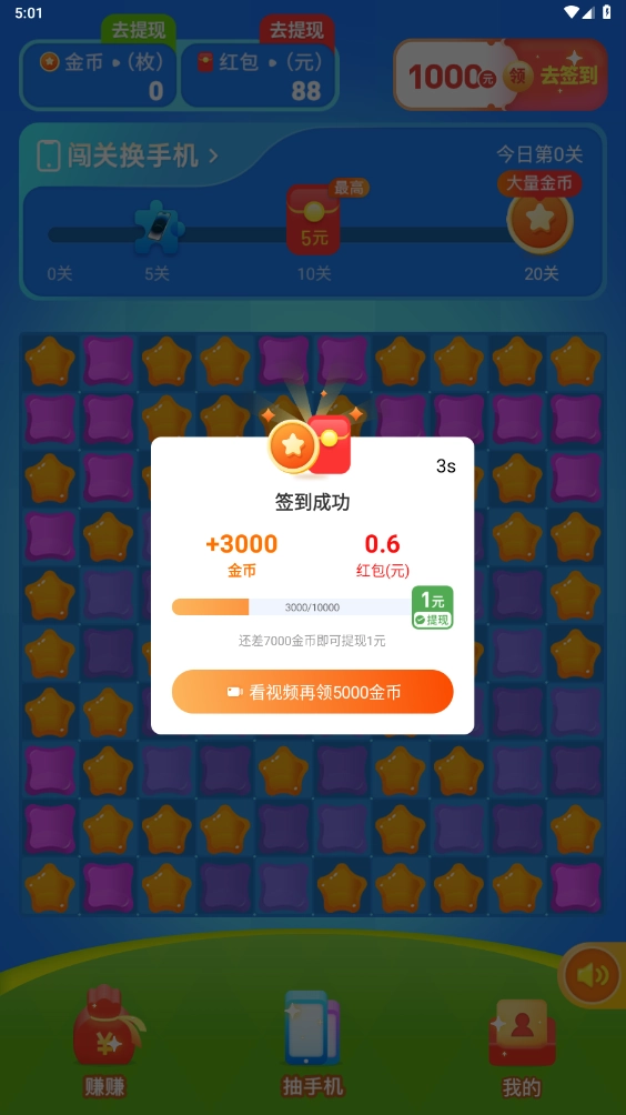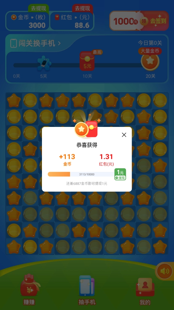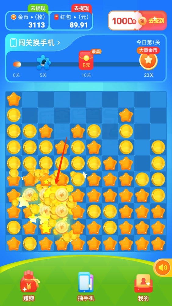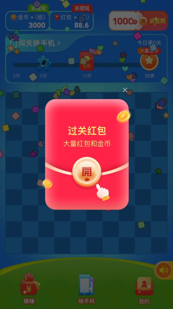 2、每一关都有一定数量的方块需要消除,全部完成即可过关拿到奖励,开启即可获得随机的红包和金币。