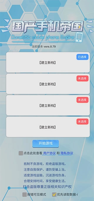 1、打开国产手机帝国最新版本,建立新存档,点击“开始游戏”。
