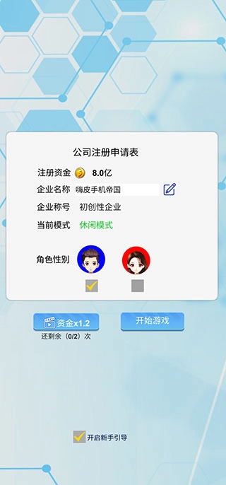 3、小编以休闲模式为例,注册新公司的名称和自己的性别,初始资金8亿。