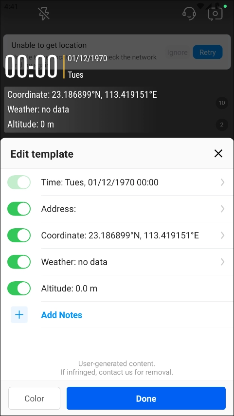 拍照时可即时添加精准的日期时间戳与地理标记