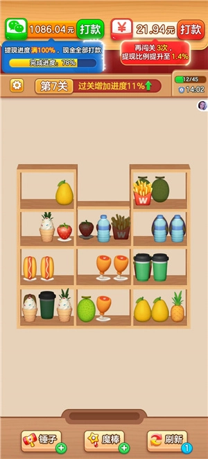 1、关卡中会出现大量商品,它们会随机分布在不同货柜里,玩家能够直接移动这些商品。