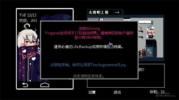 2、工作:屏幕右侧为工作,可以查看工作相关的信息,前往工作(度过一天),并且可以在商店购买道具(这里的钱指的是Jill自己的积蓄funds,而非酒吧营业的资金)。