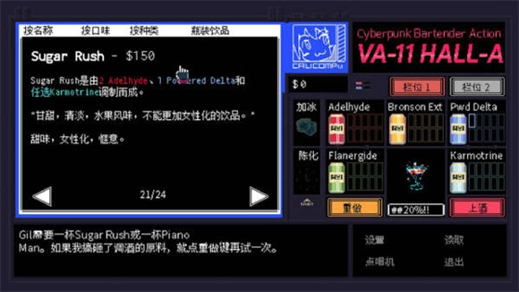 3、每种酒下面有三种属性,根据客户的需求,有时顾客不直接讲明需要,玩家自己去猜测不同的效果的酒会产生不同的对话,有时估计配错酒,会有意外的对话,也许客户很满意去和你谈心,也许直接就很快拍拍屁股走人,需要不断揣摩顾客的想法。