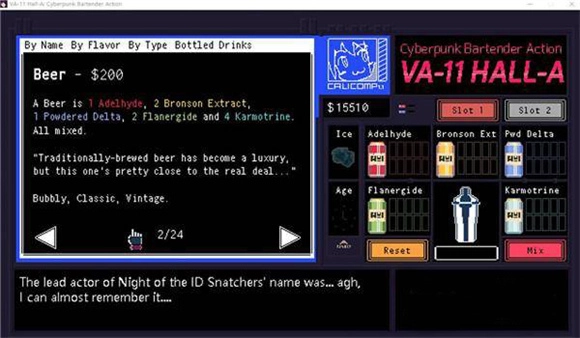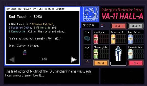 3、调配框:屏幕右侧为调配框,当中会显示五种调酒材料(adaelhyde、bronson ext、pwd delta、flanergide.karmotrine) 、两种添加物(冰块、age) 、两个槽(1槽、2槽)以及两个操作键(重置和混合)。特别注意操作键"混合",初期混合是属于轻度摇晃,当5秒钟过后则会变成快速摇晃,某些饮品属于轻度摇晃的,则不能快速摇晃。