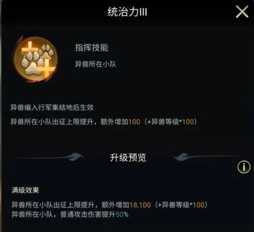 2、每个异兽的技能都不完全相同,通常来说,对于金色战斗型异兽优先培养第1个技能,这个技能可以增加该异兽所带领的战斗小队的野兽数量,有效提升部队的战斗力。异兽的第3、4技能可以增加带领战斗小队的兵种攻防,异兽的第2、5技能大多是异兽自身的技能,可以在战斗中释放,会有击杀、控制等属性。领主们可以根据自己的需求选择性培养。
