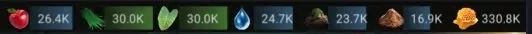 进入游戏后,留意游戏屏幕上方区域,能看到浆果、草、树叶、湿土、沙子、水、蜂蜜这七种资源,此外还有特殊资源——群落数量(即人口)。