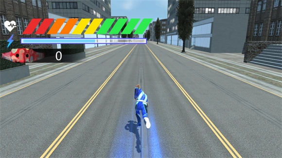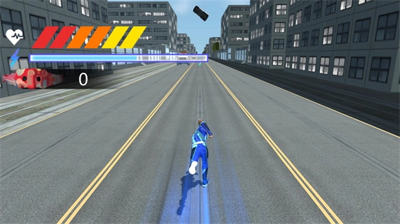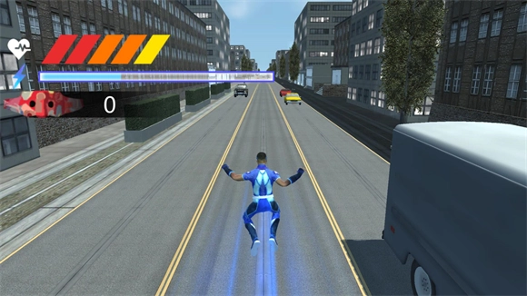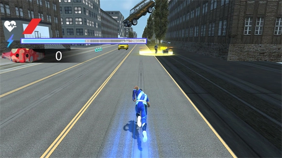 2、开始跑酷后左上角代表了你的血条、能量和正义值,每次撞倒车辆都会扣血,跑得越远分数越高。