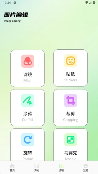 4、在编辑页面中可以进行选择滤镜、贴纸、涂鸦、裁剪、旋转以及马赛克的功能。
