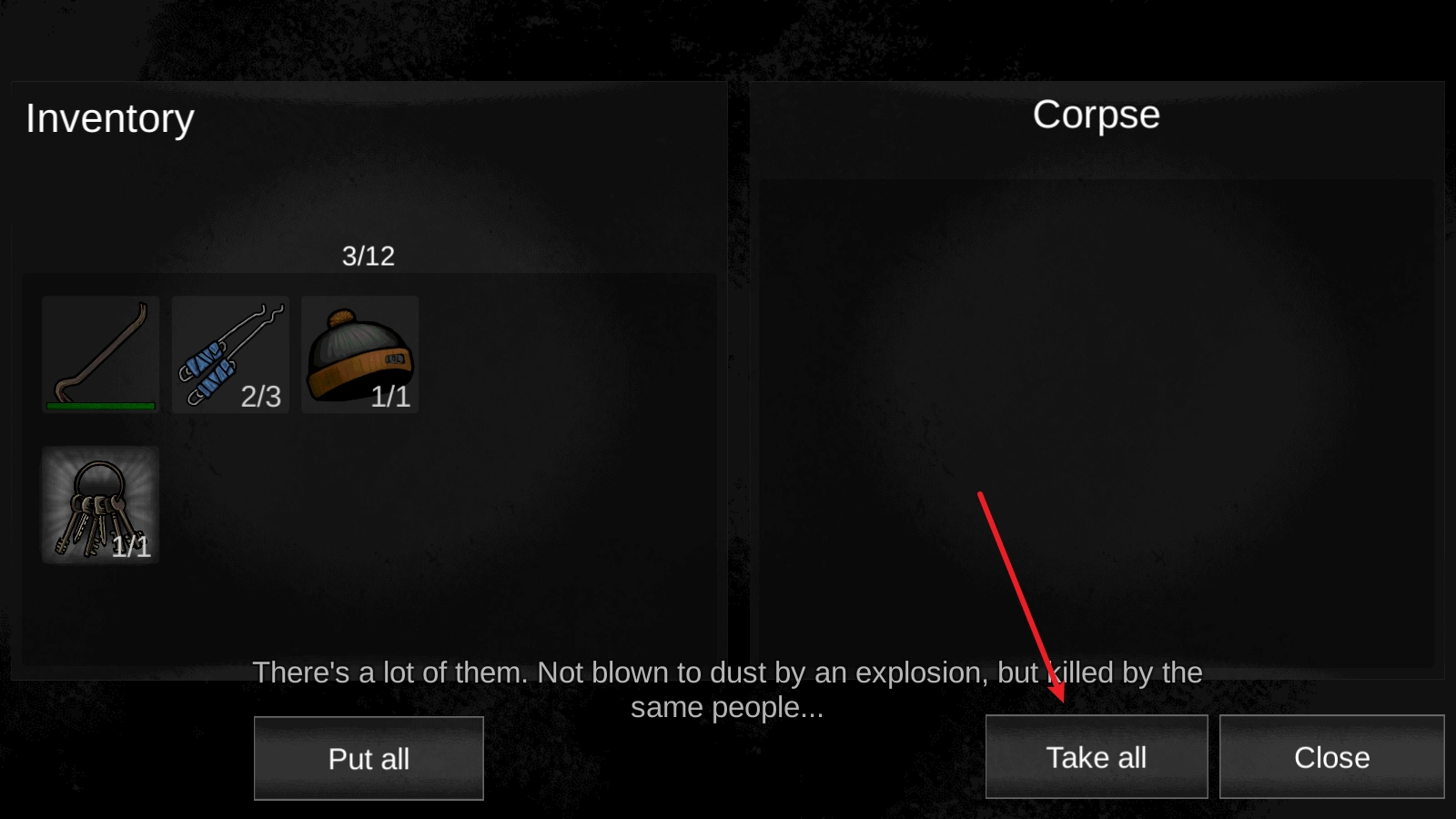 6、我们可以在场景中四处的搜集资源,靠近后点击即可打开背包,点击TAKE ALL即可全部装入背包。