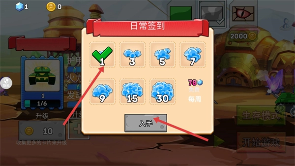 1、可进行日常签到,点击入手按钮,领取对应的奖励,这些奖励能用于后续坦克的升级等操作。