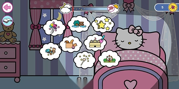 8、凯蒂猫已经睡着了,但是有许多【梦境】会以气泡显示出来,随意点击一个就可以开始游玩梦境。