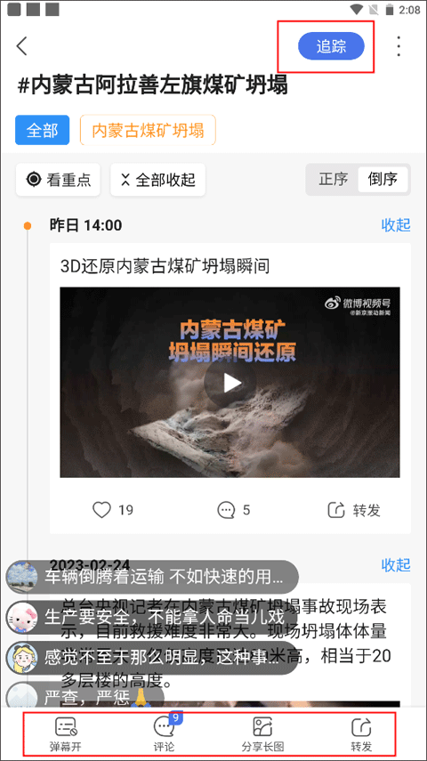 进入新闻详情页面后,点击右上角的“追踪”按钮,即可针对该事件发表个人看法或见解。