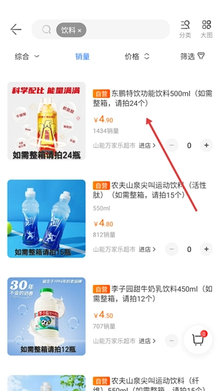 3、在商品列表中选择目标商品(如【东鹏特饮功能饮料500ml】),点击进入商品详情页。