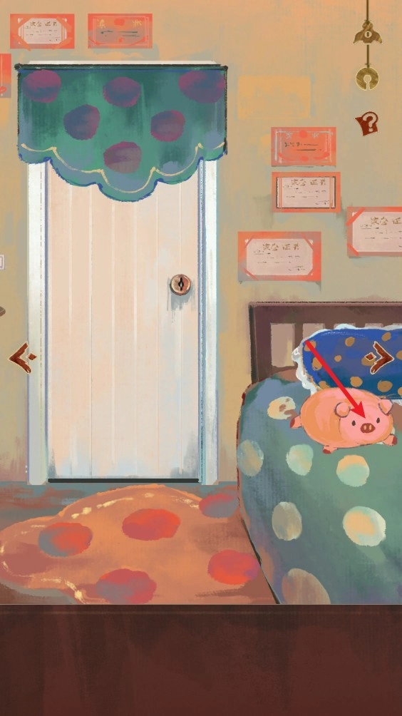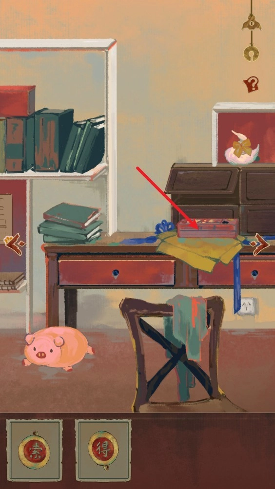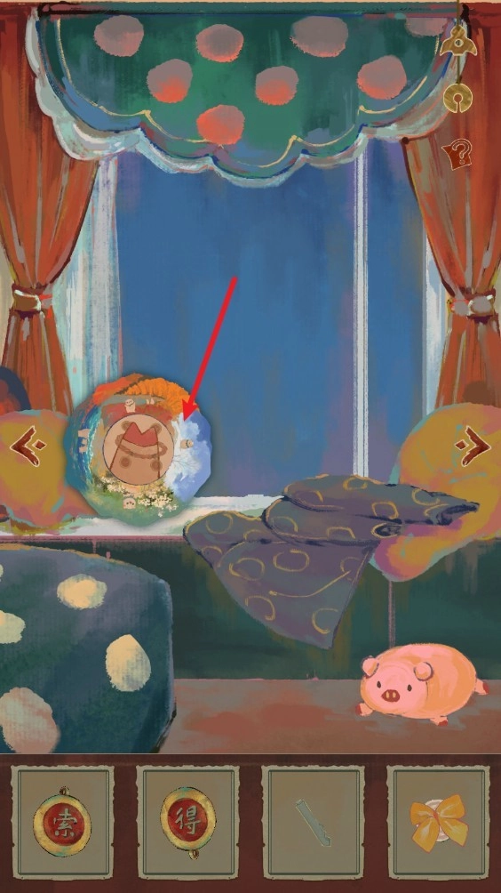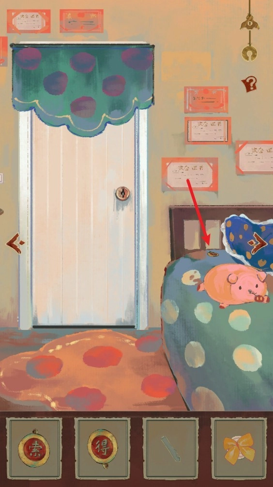 1、第一步是收集物品,猪鼻子需要“索”,从柜子里能拿到“得”,在枕头下面可以找到“男”。
