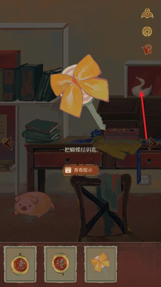 3、点击如图的这个鸭子,可以获得一般蝴蝶结,然后将钥匙拖上去即可组合出一把完整的钥匙。