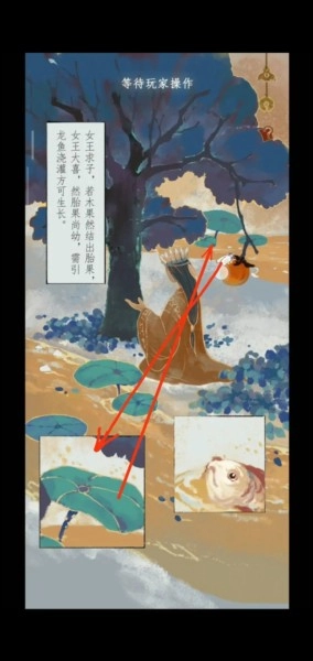 4、根据提示,拖动胎果上的玉婵到荷叶上,再用荷叶上的水浇灌胎果