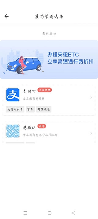 安徽的车主可以通过安徽etc手机版在线办理ETC业务(完全免费),点击【ETC办理】按钮,首先选择签约渠道