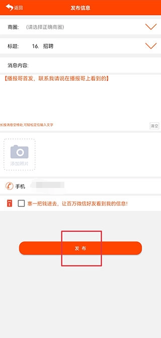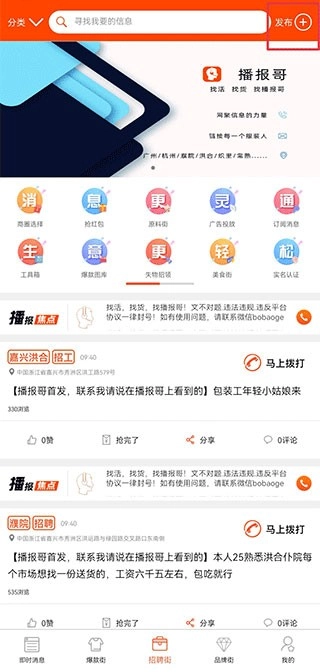 1、打开播报哥应用,进入招聘街界面后,点击右上角的发布+号按钮