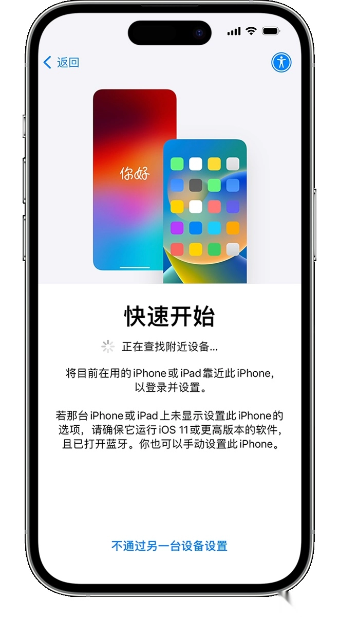 在“快速开始”屏幕上,轻点“不通过另一台 [Apple] 设备设置”,然后继续按照屏幕上的说明操作。系统可能会要求你激活 eSIM。