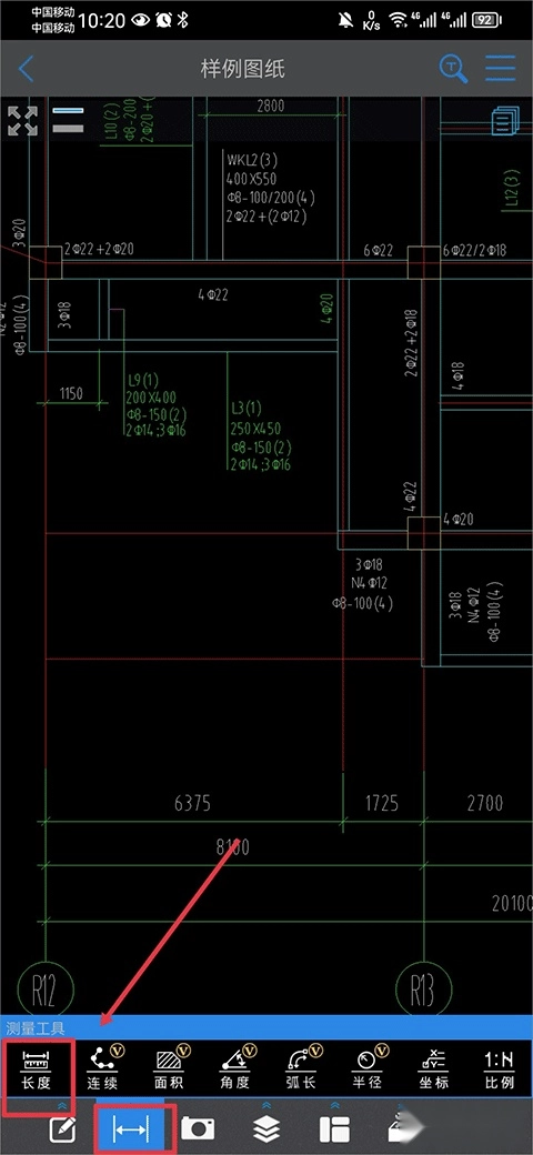 2、然后将图纸放大,并在下方功能中的测量工具内点击长度