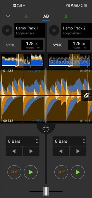 可以让用户听到经过一段时间后的混音效果。这将同步播放两首曲目,如果跳拍或者滑动波形,两首曲目也会有相同的移动量。