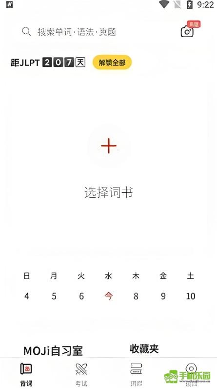 1、首先我们进入MOJiTest,在切换词书前先添加一本词书,点击中间的“选择词书”按钮。