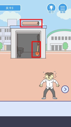 点击后面的卷帘门,获得里面的铁铲,点击上面的卷布,获得卷布。