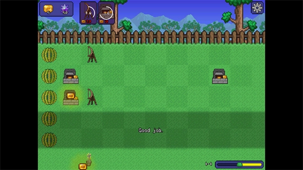 1、进入关卡后,前方会涌现大量怪物,需要及时种下第一个角色——它能够远程发射弓箭。