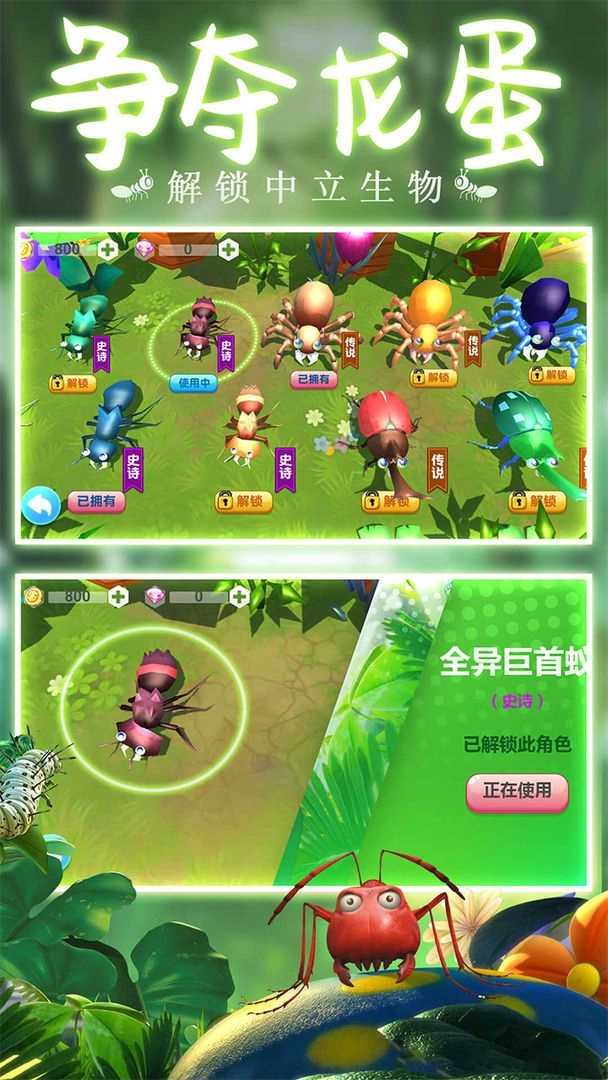 玩家可以利用各种道具帮助自己快速成长,金币、钻石都可以用来升级和解锁全新角色,各种特色的蚂蚁和昆虫应有尽有;